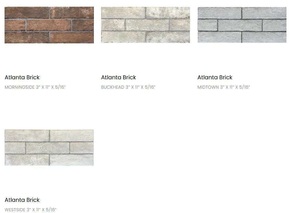 • Caliza Grand Canyon Havana Limerick Luxor Milton Milton Ridge Momentum Piazza Plume Quadrant Sedona Vintage Woodridge Alloy Andalucia Artista Atlanta Brick Barcelona Chelsea Chicklet Cotto Brick Gatsby Gresso Gibraltar Hampstead Hudson Brick Italia Kingston Wood Malibu Marmol Moroccan Nola Nomad Normandy Pacific Portofino Quarry Stella Stone Classics Tarragona Terracotta Urban Valencia Zahara Piccadilly Black Blizzard Squall