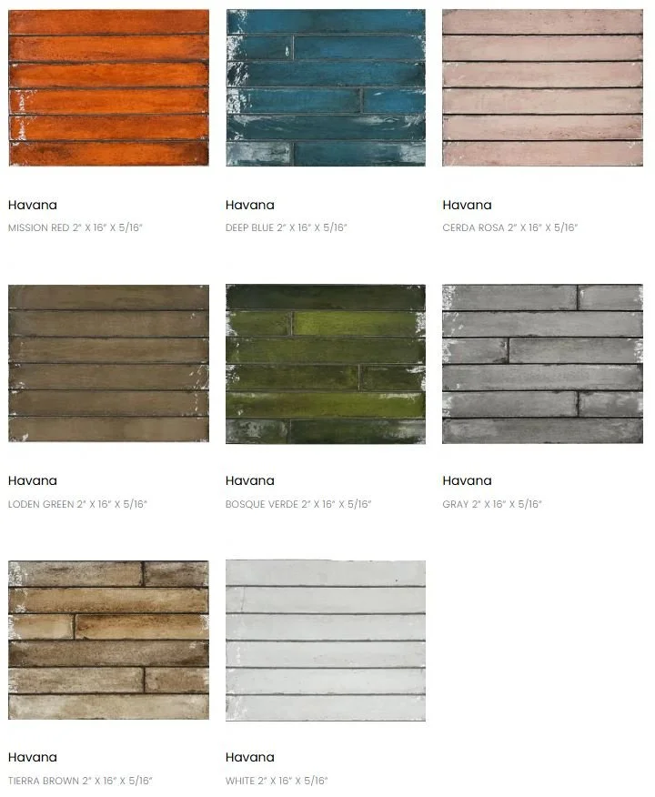 • Caliza Grand Canyon Havana Limerick Luxor Milton Milton Ridge Momentum Piazza Plume Quadrant Sedona Vintage Woodridge Alloy Andalucia Artista Atlanta Brick Barcelona Chelsea Chicklet Cotto Brick Gatsby Gresso Gibraltar Hampstead Hudson Brick Italia Kingston Wood Malibu Marmol Moroccan Nola Nomad Normandy Pacific Portofino Quarry Stella Stone Classics Tarragona Terracotta Urban Valencia Zahara Piccadilly Black Blizzard Squall