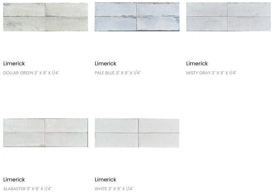 • Caliza Grand Canyon Havana Limerick Luxor Milton Milton Ridge Momentum Piazza Plume Quadrant Sedona Vintage Woodridge Alloy Andalucia Artista Atlanta Brick Barcelona Chelsea Chicklet Cotto Brick Gatsby Gresso Gibraltar Hampstead Hudson Brick Italia Kingston Wood Malibu Marmol Moroccan Nola Nomad Normandy Pacific Portofino Quarry Stella Stone Classics Tarragona Terracotta Urban Valencia Zahara Piccadilly Black Blizzard Squall