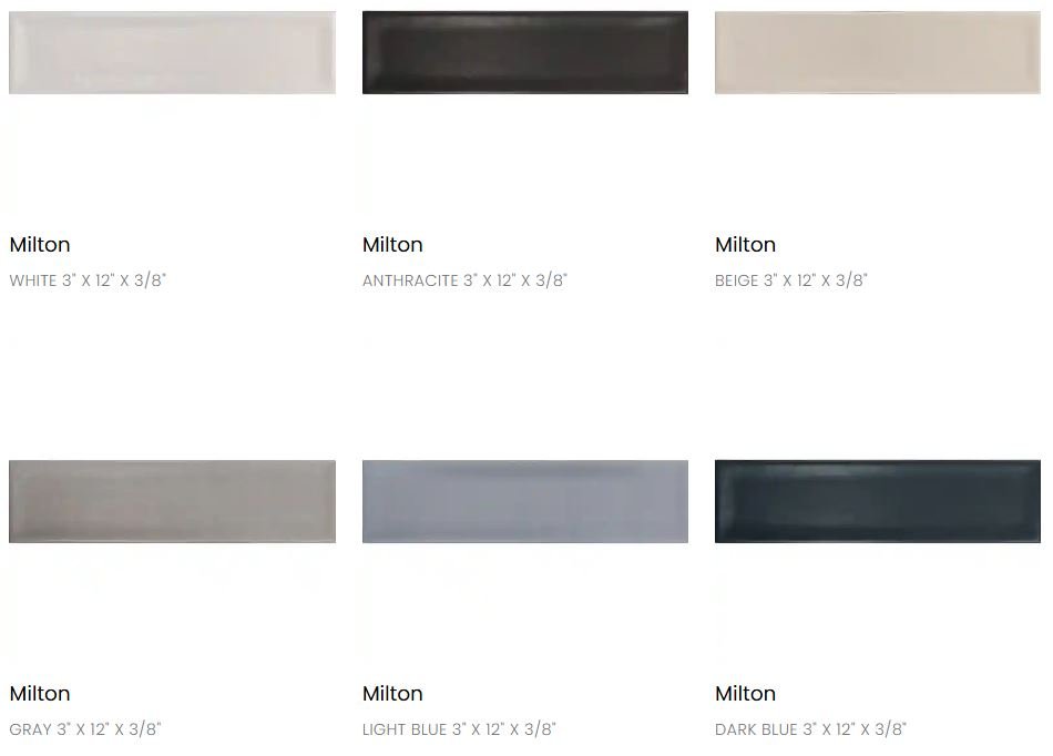 • Caliza Grand Canyon Havana Limerick Luxor Milton Milton Ridge Momentum Piazza Plume Quadrant Sedona Vintage Woodridge Alloy Andalucia Artista Atlanta Brick Barcelona Chelsea Chicklet Cotto Brick Gatsby Gresso Gibraltar Hampstead Hudson Brick Italia Kingston Wood Malibu Marmol Moroccan Nola Nomad Normandy Pacific Portofino Quarry Stella Stone Classics Tarragona Terracotta Urban Valencia Zahara Piccadilly Black Blizzard Squall