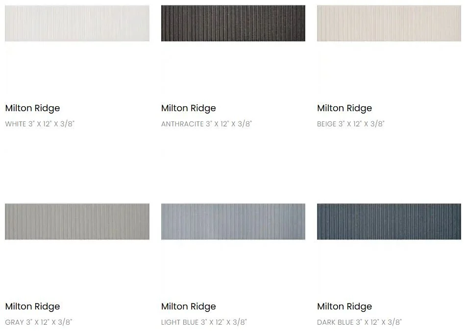 • Caliza Grand Canyon Havana Limerick Luxor Milton Milton Ridge Momentum Piazza Plume Quadrant Sedona Vintage Woodridge Alloy Andalucia Artista Atlanta Brick Barcelona Chelsea Chicklet Cotto Brick Gatsby Gresso Gibraltar Hampstead Hudson Brick Italia Kingston Wood Malibu Marmol Moroccan Nola Nomad Normandy Pacific Portofino Quarry Stella Stone Classics Tarragona Terracotta Urban Valencia Zahara Piccadilly Black Blizzard Squall