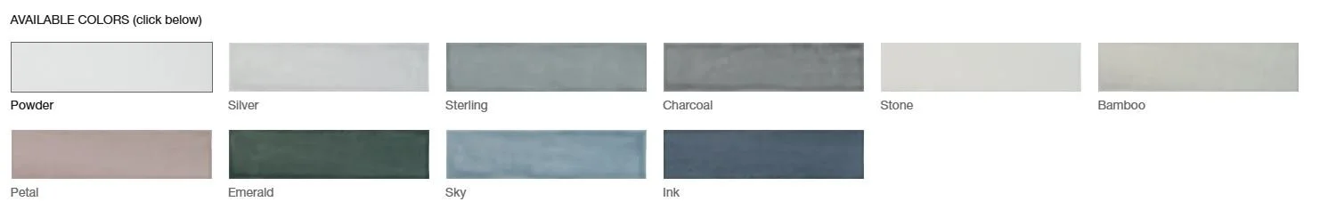 • Caliza Grand Canyon Havana Limerick Luxor Milton Milton Ridge Momentum Piazza Plume Quadrant Sedona Vintage Woodridge Alloy Andalucia Artista Atlanta Brick Barcelona Chelsea Chicklet Cotto Brick Gatsby Gresso Gibraltar Hampstead Hudson Brick Italia Kingston Wood Malibu Marmol Moroccan Nola Nomad Normandy Pacific Portofino Quarry Stella Stone Classics Tarragona Terracotta Urban Valencia Zahara Piccadilly Black Blizzard Squall